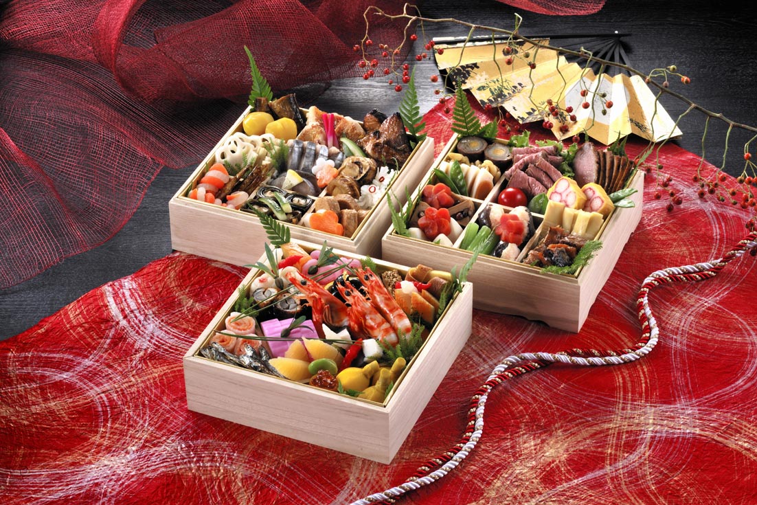 白木の重箱(19.5cm×19.5cm×三段)にぎっしり詰まったおせち三段重です。